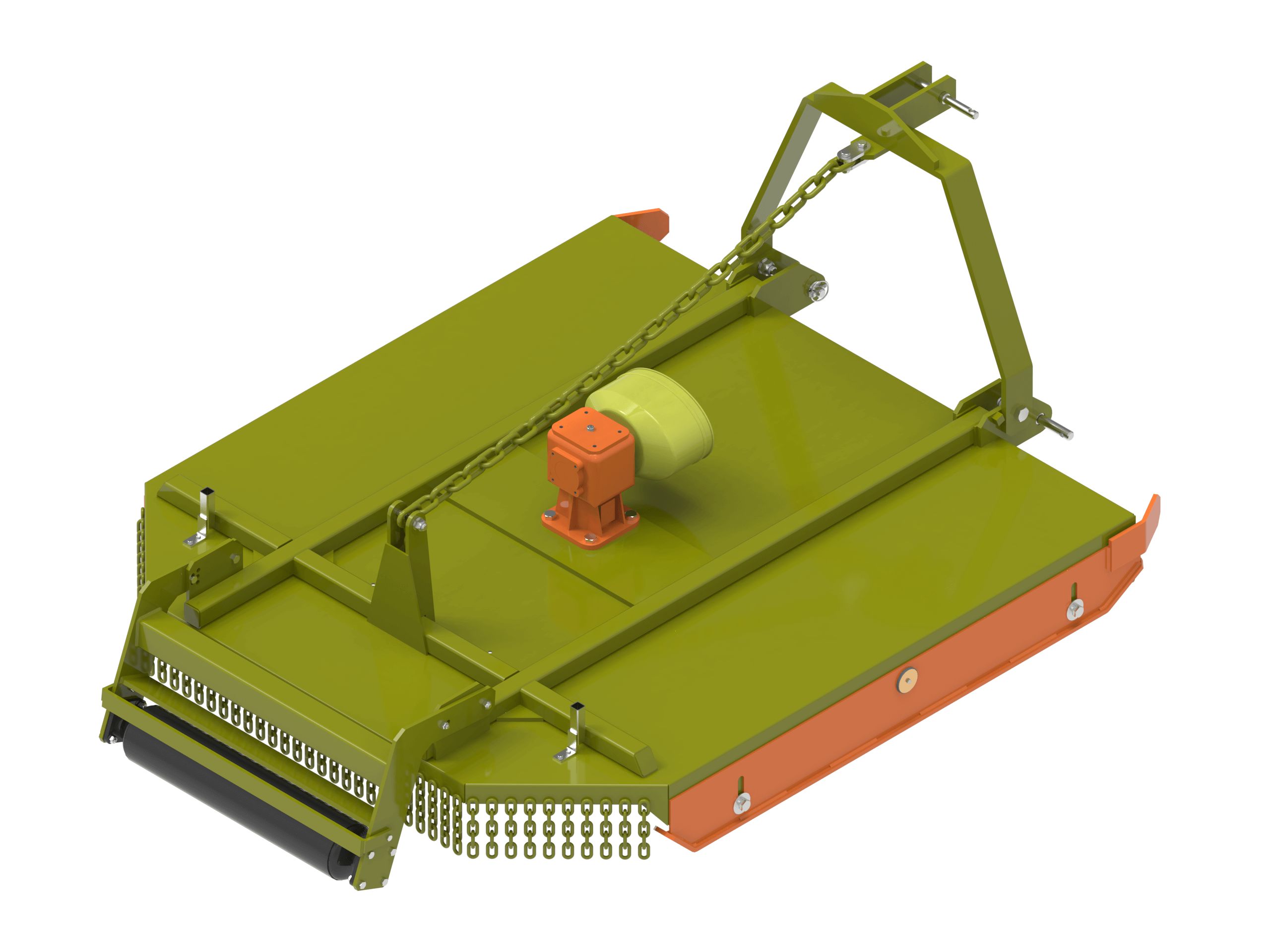 Mulching machine with one rotor for mowing and mulching grass or mowing scrubs in vineyards and orchards, on pasturelands and parks, with possibility of crushing strong weeds, thinner wood or small bushes.